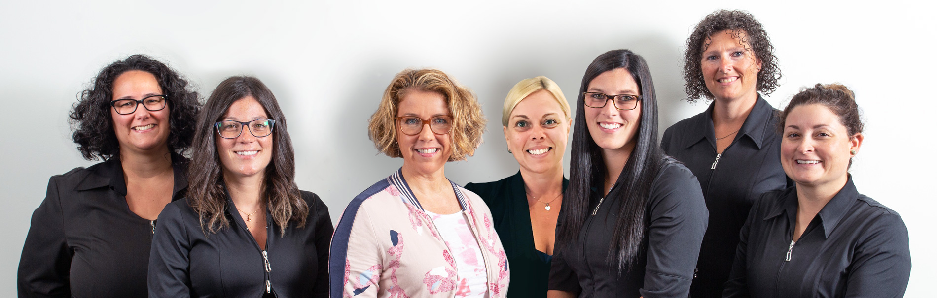 En plus de voyager avec une partie de son équipe de Montréal, Dre Lapointe travaille étroitement avec l’équipe de la Clinique dentaire de l’Archipel et son personnel qualifié :(De gauche à droite)